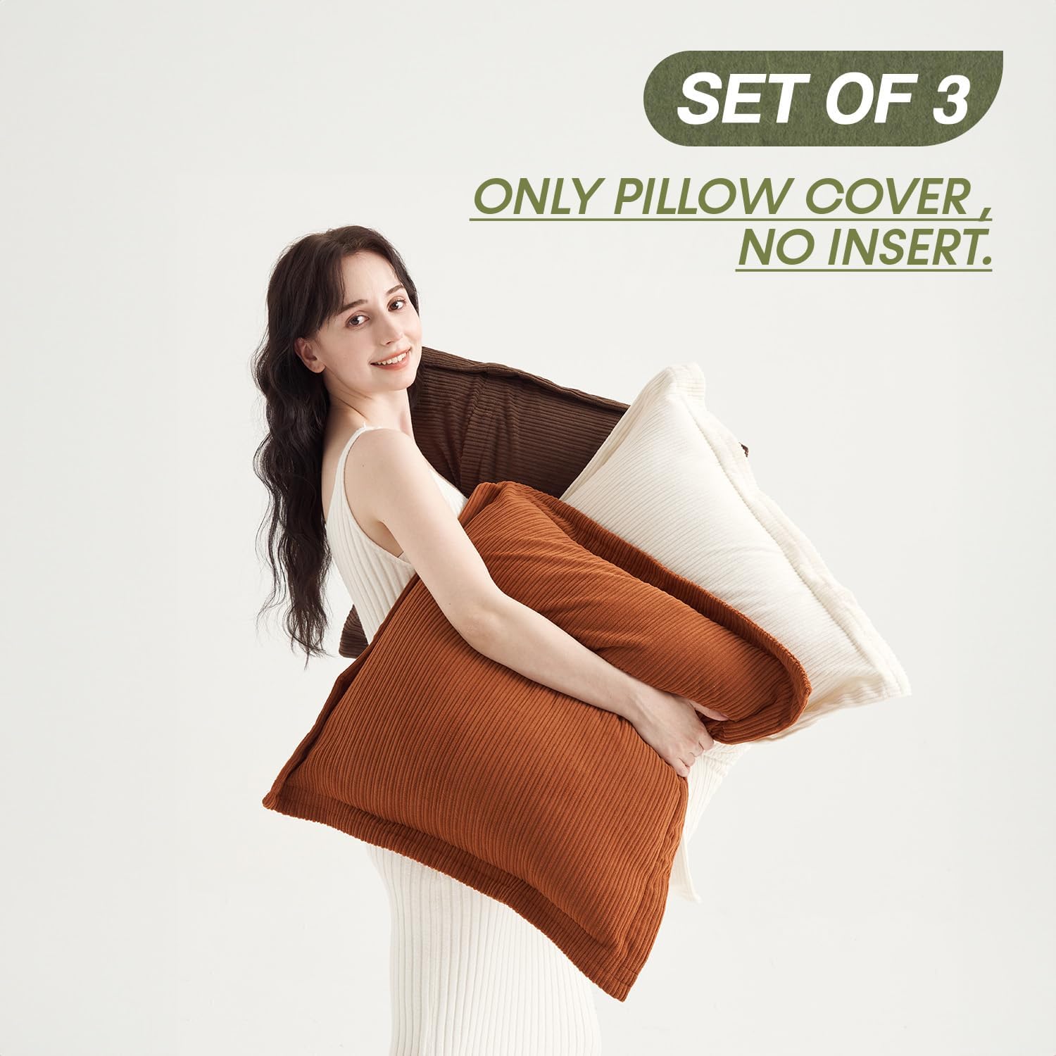 Set of 3 Vintage Big Pillow Covers 24x24inch, Super Soft Striped Corduroy Boho Large Cushion Cases, Ideal for Spacious Living Areas & Bedrooms & Farmhouse(Earthy Brown, Rust & Cream)