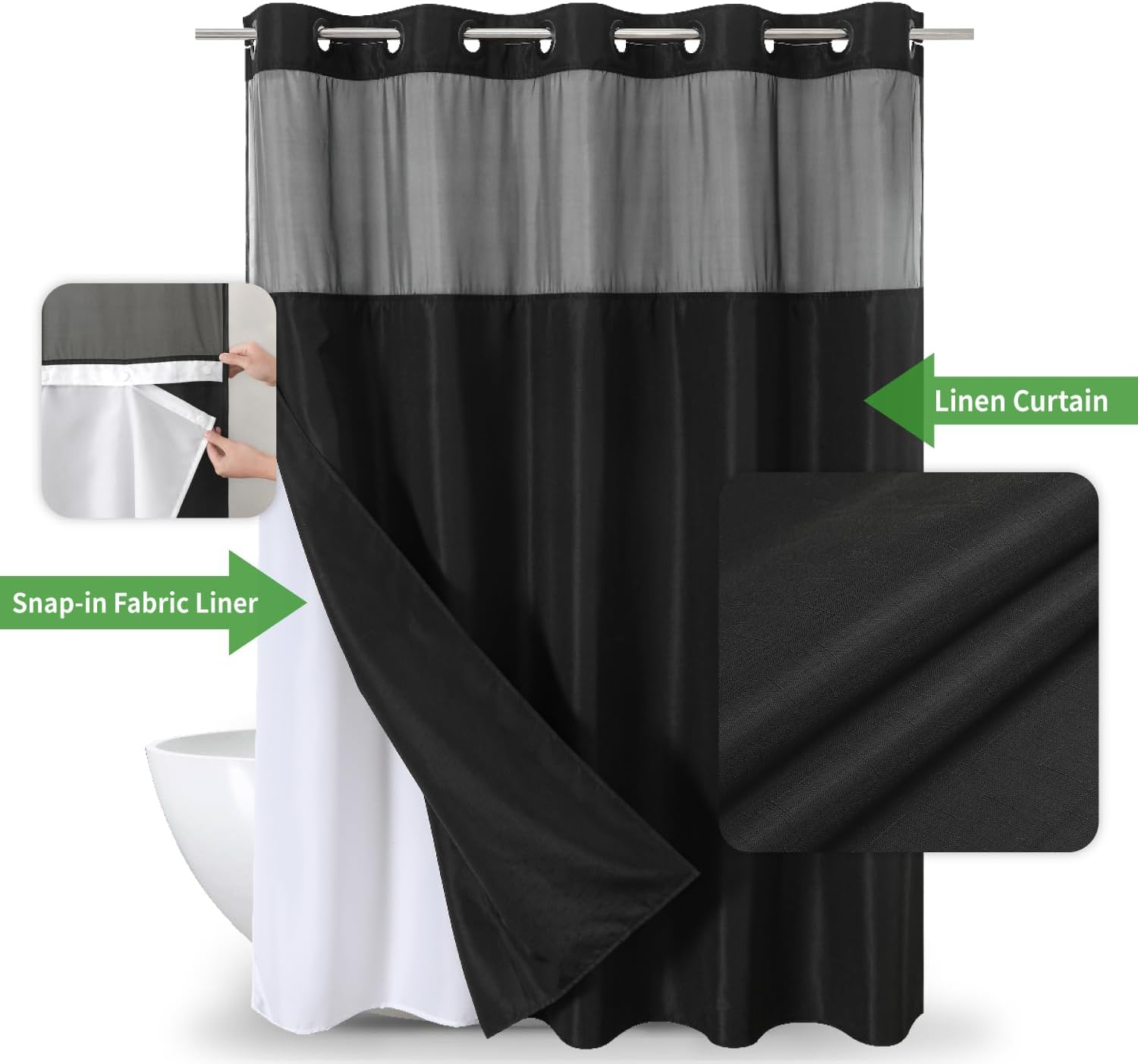 No Hooks Needed Linen Textured Shower Curtain with Snap-in Fabric Liner Set,Black Hotel Luxury Decor Shower Curtains for Bathroom with Mesh Top Window,Waterproof & Washable,71Wx74H