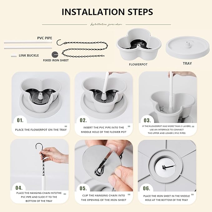 - Simplified Gardening: Each pod is 13 x 5.1 Inch (LXH), and the tray height is 3.54 Inch(H), filter tray is 12 Inch, and total height is 2.52 FT(H), iron chain is 37.5 inch.This planter allows for versatile stacking options: 2, 3, or even 4 tiers high. Additionally, it can be suspended using chains or positioned on a cylindrical pole.