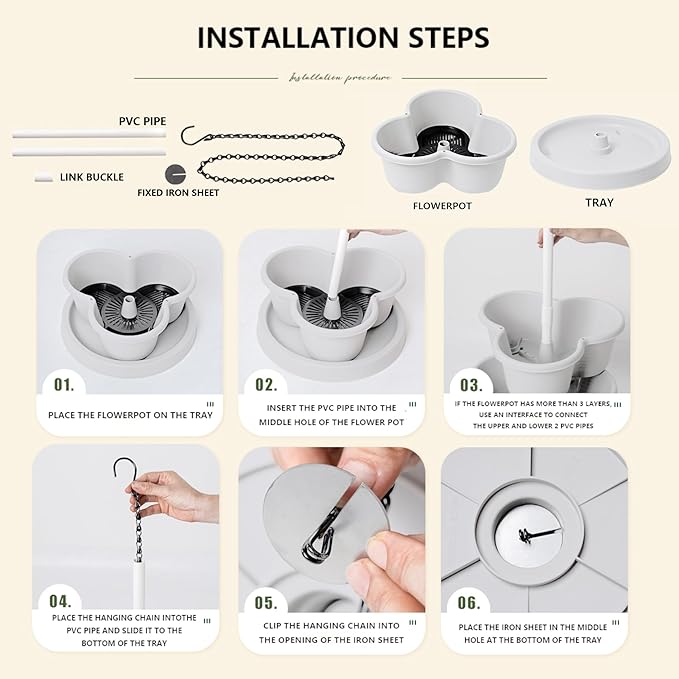 - Simplified Gardening: Each pod is 13 x 5.1 Inch (LXH), and the tray height is 3.54 Inch(H), filter tray is 12 Inch, and total height is 2.52 FT(H), iron chain is 37.5 inch.This planter allows for versatile stacking options: 2, 3, or even 4 tiers high. Additionally, it can be suspended using chains or positioned on a cylindrical pole.