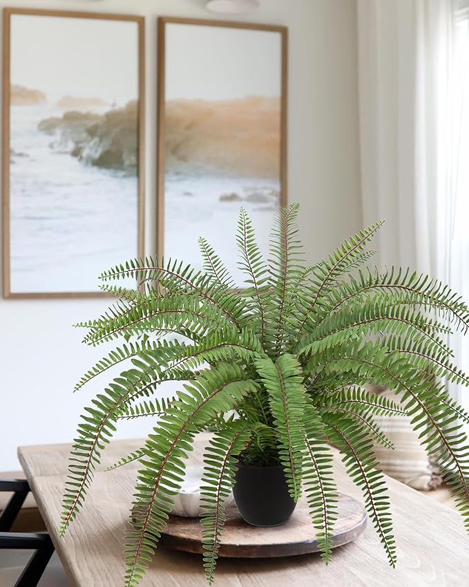 - 【Multi-scene Decoration Use】 Artificial fern is designed for outdoor & indoors decoration. These lifelike faux Boston ferns for outdoor planter large add a charming conception to your front porch, walkway, garden, kitchen,Office, windowsill, living room, bedroom, terrace and garden fence. Artificial ferns potted for outdoors large is very suitable for daily home garden decoration, birthdays, holidays, weddings, memorial places etc.
