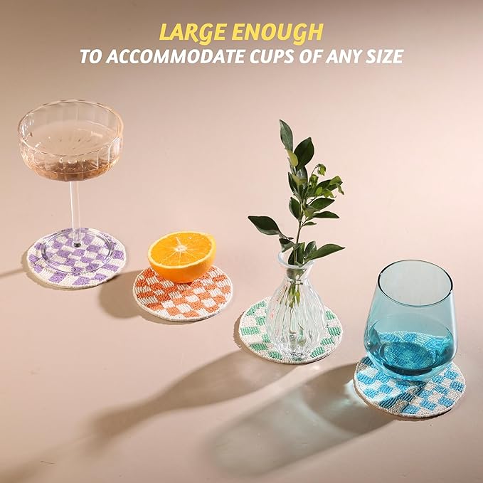 - [ PERFECT SIZE ] - These drinks coasters will hold your coffee, cocktails, wine and more with its ideal size of 4" inch diameter. These coasters for desk or cup coasters for drinks come in a set of 4 with glass beads to add elegance and panache.