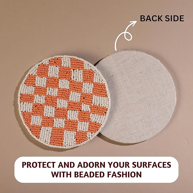 - [ HANDMADE DESIGN ] These beaded wine coasters are handcrafted and add a touch of boho grandeur to your tableware. The fun coasters have beautiful boho motifs in the middle at the centre and is bordered by shiny white toned beads.