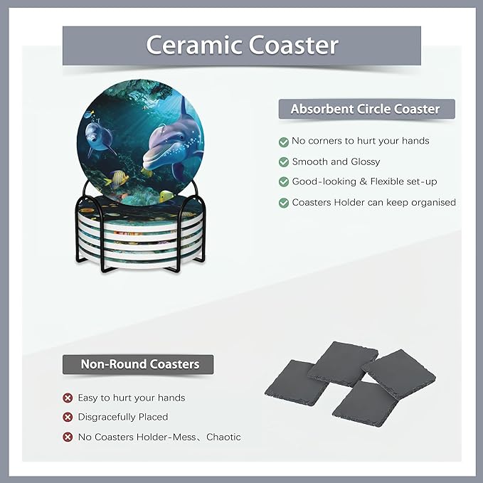 - 【Water-absorbing Ceramics】These coasters are super water-absorbent, the cork back can avoid scratching your furniture and prevent coasters falling off the table.
