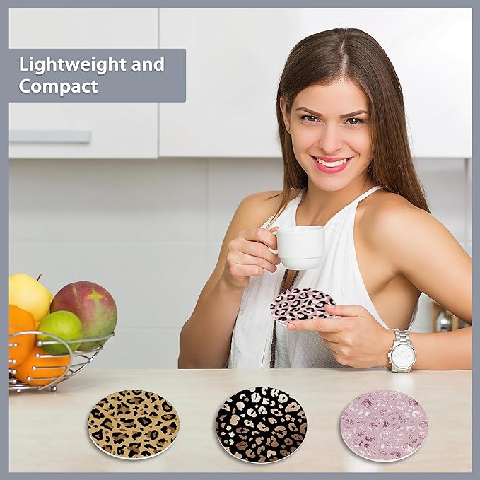 Drink Coasters Set of 6 with Holder,Leopard Print Brown Grey Gold Pink Absorbent Ceramic Coasters with Cork Base,Fit All Cups,Tabletop Protection Mat for Mugs and Cups,Office,Kitchen