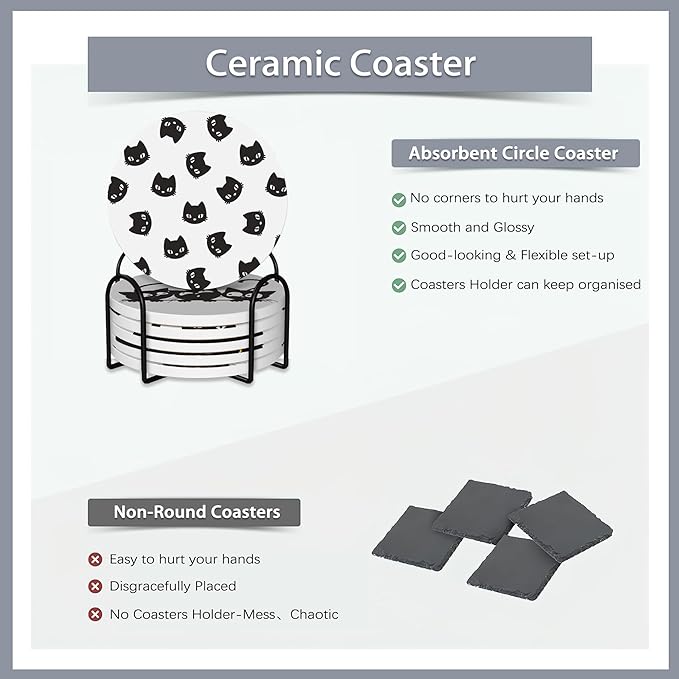 Drink Coasters Set of 6 with Holder,Cute Black Cat Absorbent Ceramic Coasters with Cork Base,Fit All Cups,Tabletop Protection Mat for Mugs and Cups,Office,Kitchen