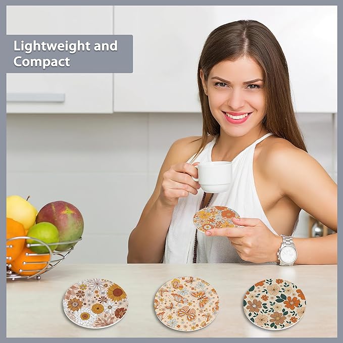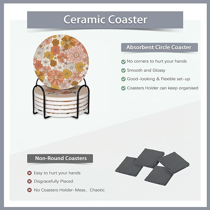 6 Pcs Coasters for Drinks with Holder,Retro 70s 60s Floral Hippie Flowers Absorbent Coaster with Cork Backing,Great Gift for Housewarming,Room Decor,Bar,Holiday Party