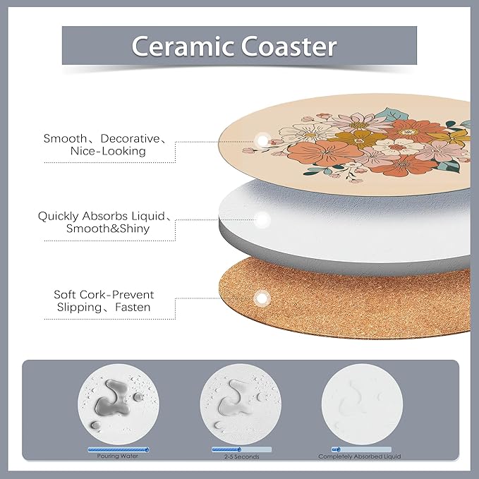 - 【Water-absorbing Ceramics】These coasters are super water-absorbent, the cork back can avoid scratching your furniture and prevent coasters falling off the table.