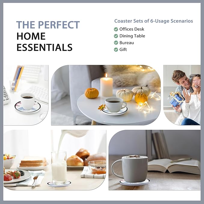 - 【Non Slip & Easy Clean】The coasters are smooth to the touch and measure 4 inches making it perfect for any beverage cup. Now you can confidently place your wet drinks or hot beverages on your coffee and dining tables. Simply clean them with a damp cloth and wipe them off within seconds.