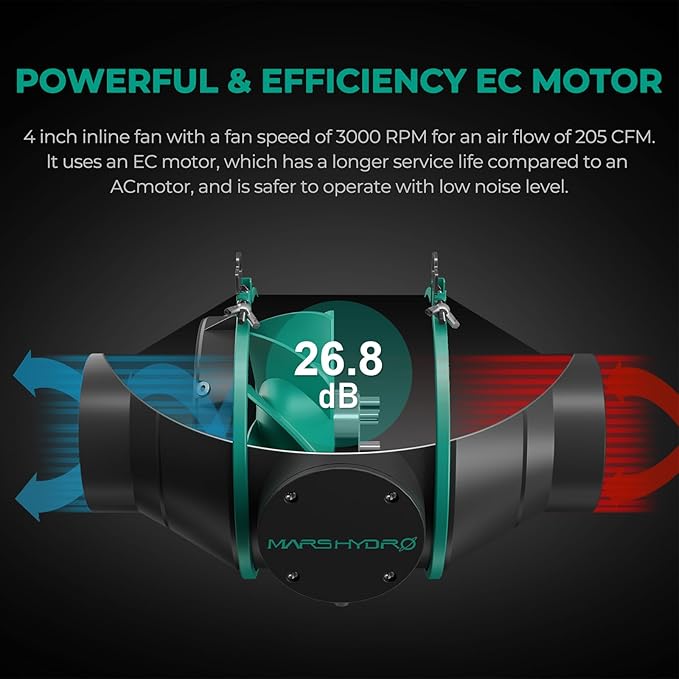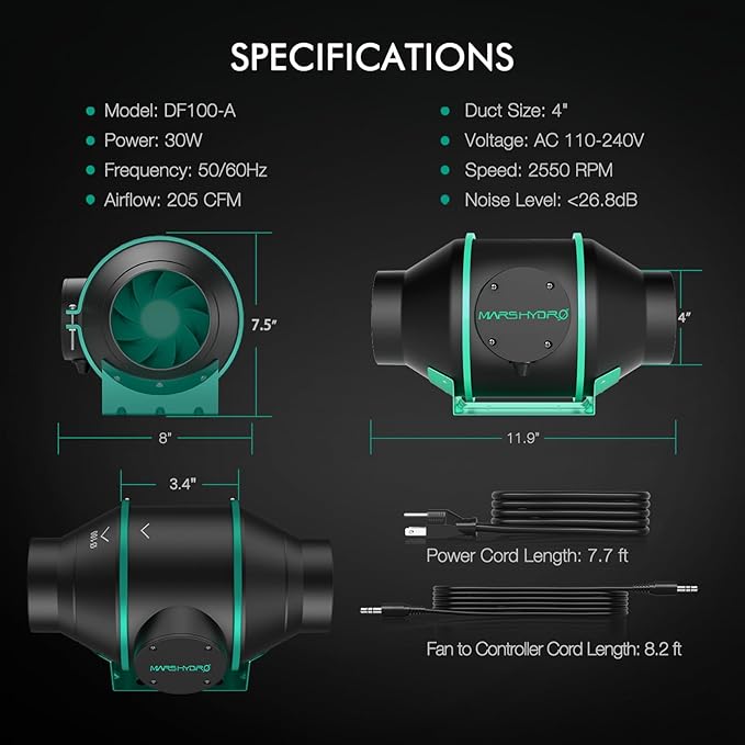 - 【205CFM EFFICIENT VENTILATION SYSTEM】The inline fan blades have a mixed flow design, the fan runs at 2600 RPM and provides 205CFM of airflow. Only 26.8 dB noise. 1050+ RC 48 Australian Virgin Charcoal with 25ft ducting,effectively filters impurities and odors from the air.The Temperature Humidity Controller can set the temperature and humidity that trigger the fan ON/OFF.