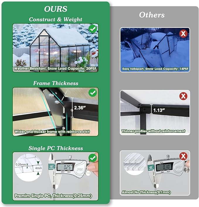 - 【Sturdy Frame】Our greenhouse kit boasts a robust rust-resistant aluminum frame designed to withstand various weather conditions. 2 skilled enthusiasts can assemble this greenhouse kit in just 4 hours. Introducing patented technology, Easy assembly, saving you 50% of your time. Gone are the days of tedious setups. With a simple push and locking screw, our Quick Connect ensures a reliable, secure, and swift link-up. It can also support snow loads of up to 20PSF.