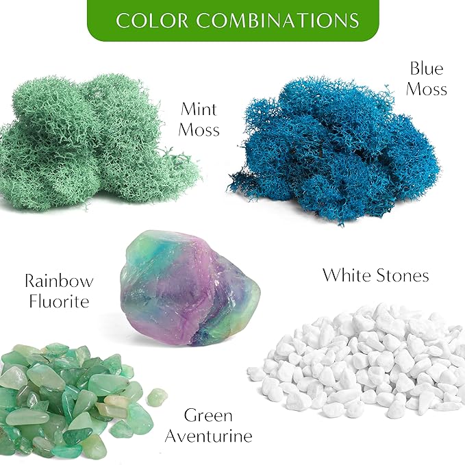 - ALL-IN-ONE TERRARIUM KIT WITH LIVE PLANTS: Includes a 6" glass chalice bowl, live air or succulent plants, moss, crystals, pebbles, tools, soil, and a figurine. Everything you need to grow a vibrant, self-sustaining mini ecosystem from scratch.