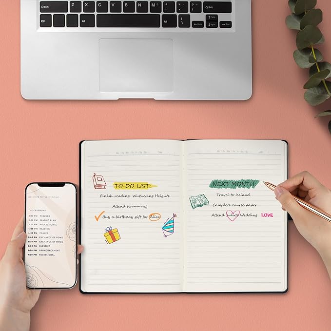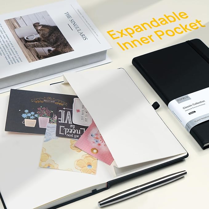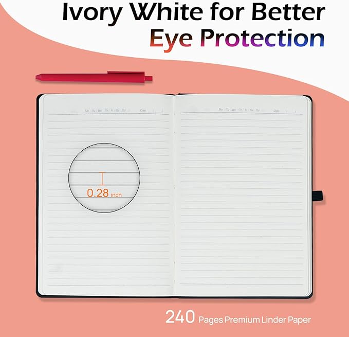 - 【Humanity Detail Design】This classic ruled notepad is designed to lay flat 180°, making it easier to write and take notes comfortably. Elastic pen loop provide more convenient for carrying different sizes’ pens. 1 Expandable inner pocket can easily store notes, bills, receipts, appointment cards, and more. And 1 ribbon bookmark helps quickly find the correct page.