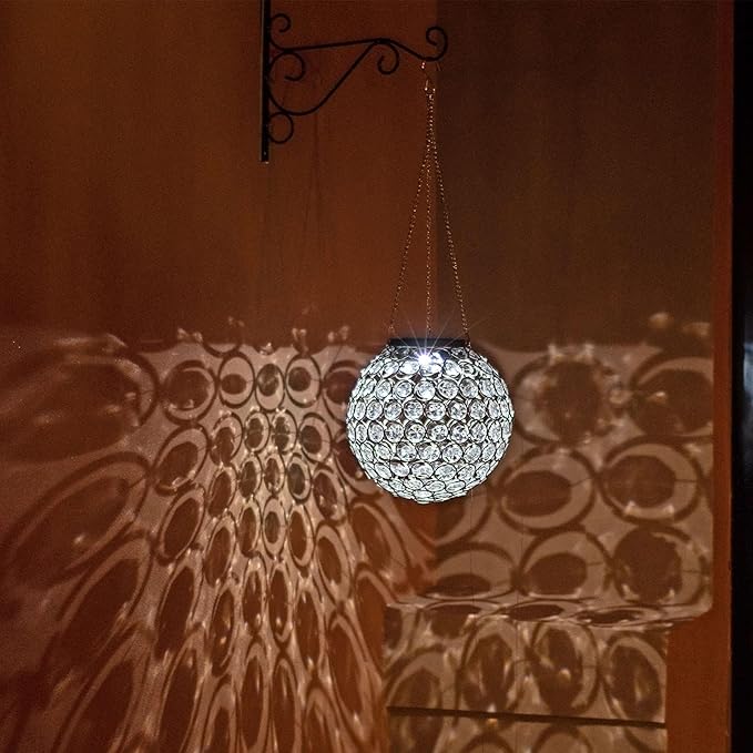 - 【Hand-made Lantern】Dia 7.5 inch solar lantern is designed with hollowed-out pattern, it beams attractive and beautiful light throughout the orb in the night. During the day, the solar lantern sparkles in the sunlight by these polygonal acrylic pieces. Metal frame makes this decorative lantern more sturdy.