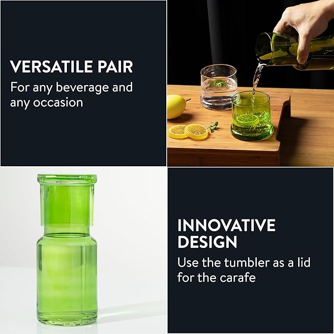 Elixir Glassware Bedside Water Carafe and Glass Set with Integrated Cup - Water or Mouthwash Dispenser for Nighstand or Bathroom - Handblown Glass Pitcher with Tumbler - Green