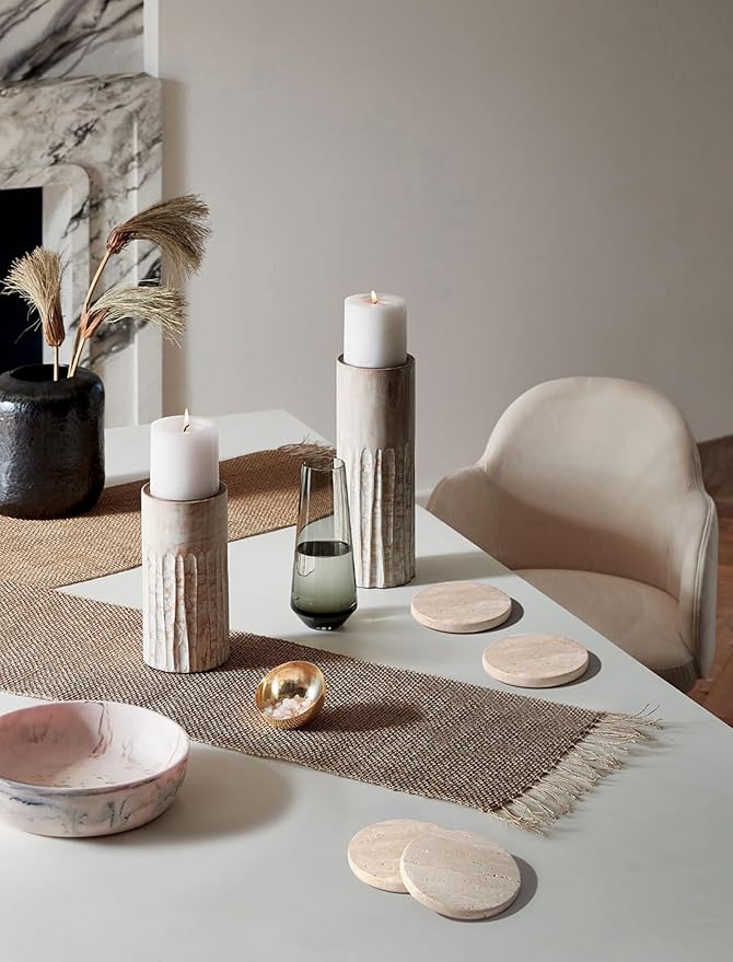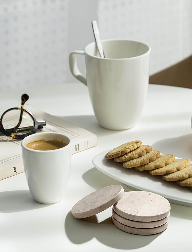 Beige Travertine Coasters Set of 4,Marble Absorbent Coasters 4 '',Ideal for Housewarming Gifts, Anniversaries, Office Decorations - Protects countertops - Sturdy and Durable, Beautiful and Generous