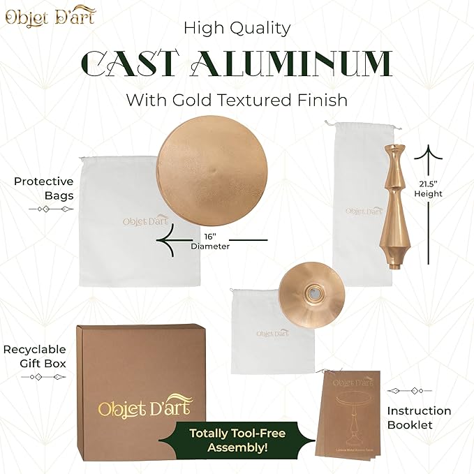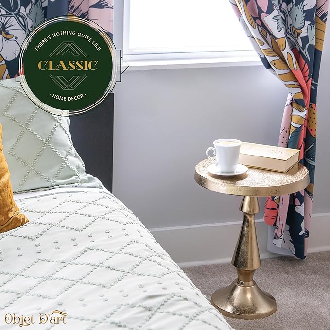 - UNIQUE HOME DECOR Made from high quality cast aluminum, our metallically accented side tables are handcrafted by skilled artisans. Along with its excellent resistance to corrosion, it has an antique gold finish that's sure to set you and your home apart. This accent table is lovely and distinctive by design.