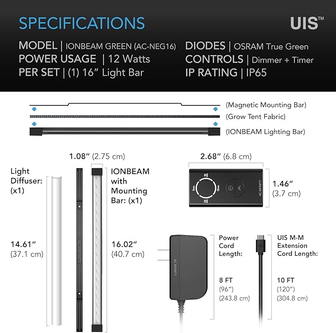 AC Infinity IONBEAM Green, Plant Gentle Green LED Work Light Bar 16”, Timer Controller Dimmer, for Indoor Plants, Grow Tents, and Grow Rooms
