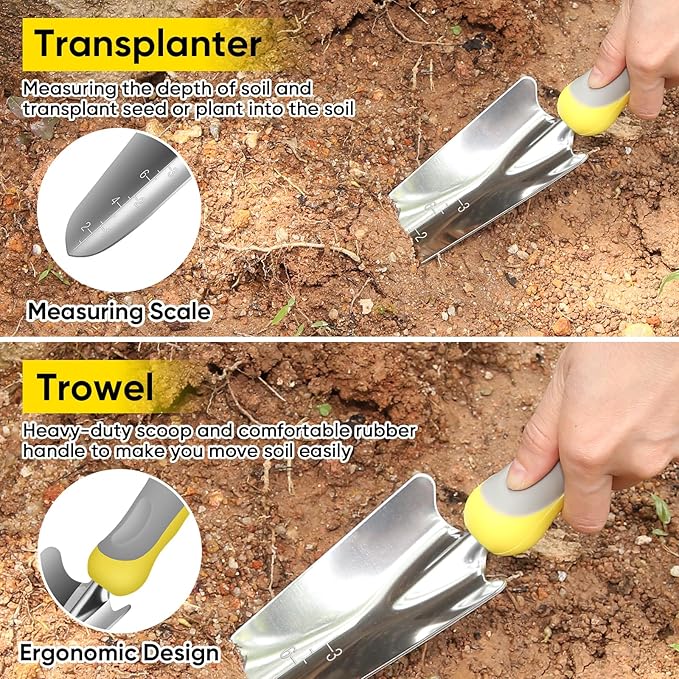 - 【Thickening & Rust Proof】Made of thicker heavy duty stainless steel, our gardening hand tools are harder,rust-proof, sharper,and won't bend or break during gardening use. Our gardening tool set are thicker, superior, longer lasting and more reliable than other garden tools made from lower grade materials. This gardening kit with precise polishing process,making blades sharper, glossy,wear-resistant, easy to cutting or digging. (Tips: Please keep it clean after use to prolong its service life)