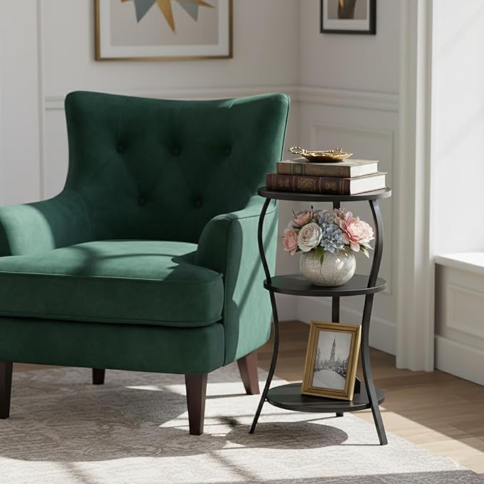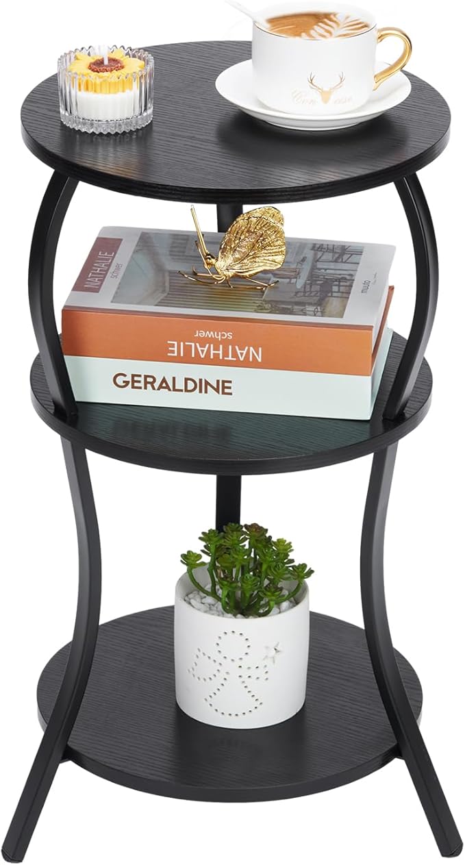 Vintage Small Round Side Table, 3-Tier Slim Waist Circular End Table with Storage Shelf, Compact Tea Sofa Side Table, Round Corner Coffee Table Nightstand for Living Room Bedroom Small Spaces,Black
