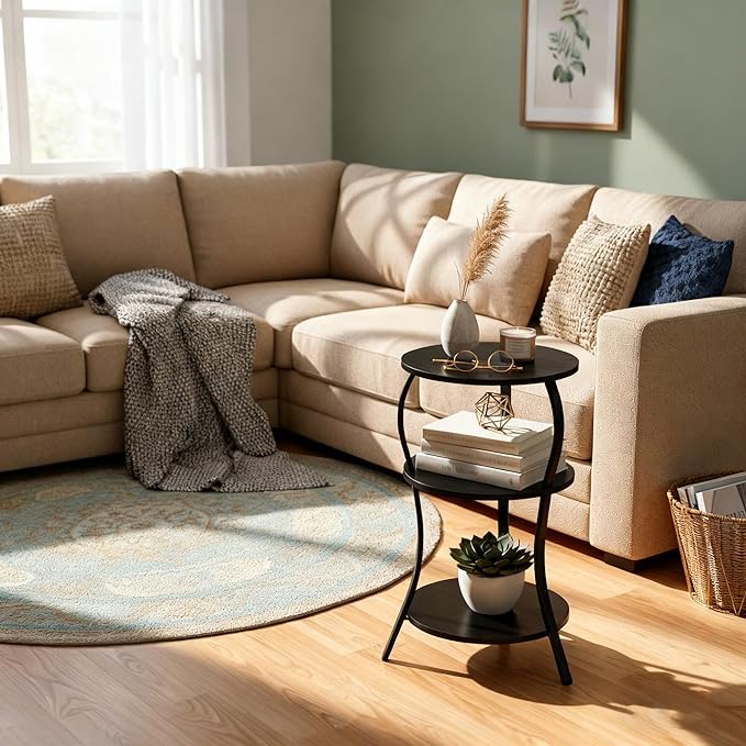 - 【 BEST FOR SMALL SPACE】 If you have limited space and looking for a small storage table,this 3 tier round end table offer a space-saving solution for you. Lightweight, compact and easy to move. Size: 11.8 * 11.8 * 21.7 inches/30*30*55cm. It can prop up your coffee, books beside the sofa or even as a storage rack in the living room, dorm or small space! It is ideal for phones, snacks, books, desk lamp and small pot plants.
