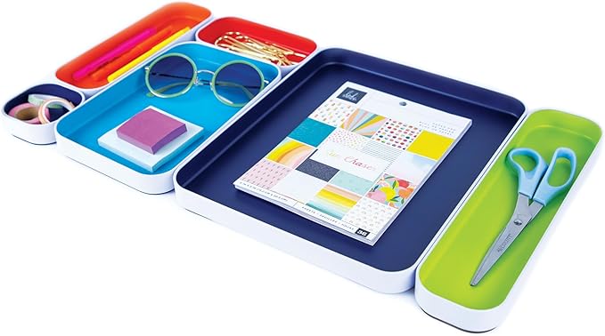 Three by Three Seattle 6 Piece Metal Organizer Tray Set for Storing Makeup, Stationery, Utensils, and More in Office Desk, Kitchen and Bathroom Drawers (1 Inch, Assorted Colors, Stripes)