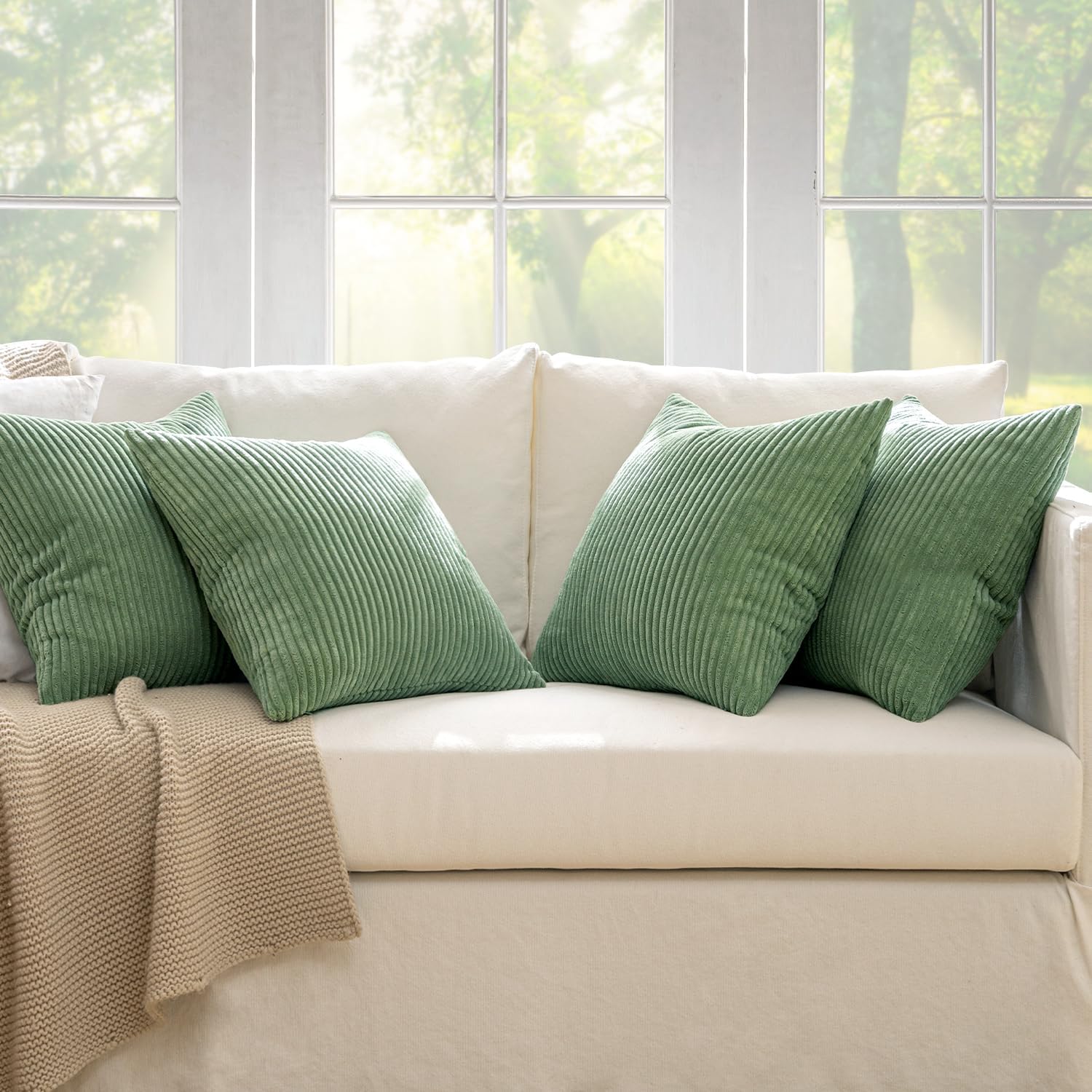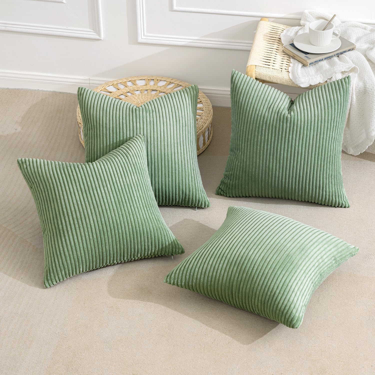 MIULEE Boho Farmhouse Throw Pillow Covers 18x18 Inch Set of 4 Mordern Nordic Cushion Covers Soft Corduroy Home Decor for Couch Bed Sofa Living Room Sage Green