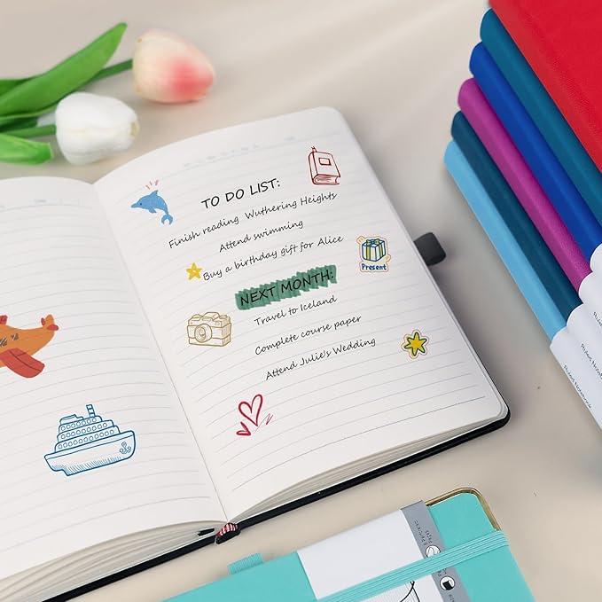 - Bright & Bold Colors: Our notebook journals for women & men are designed with 8 colors-Black, Red, Raspberry, Sky Blue, Klein Blue, Night Sky Blue, Mint, Turquoise. The size of the notebooks for work is 5.5" x 8.3", portable. A5 travel journal fits for note taking, life scheduling, journaling, teaching and studying. Great journal notebook for Christmas gift, business work, college, travel, school, office and home. This makes for an exceptionally special and perfect Christmas present to share with your friends and family