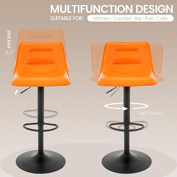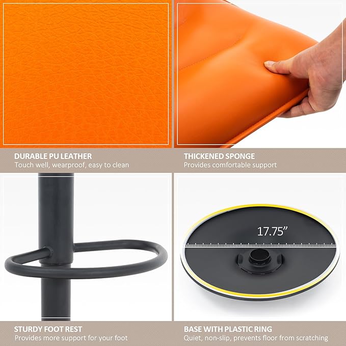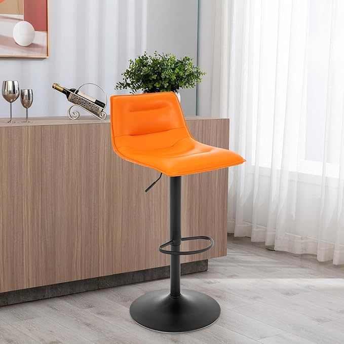Brage Living Adjustable Bar Stool, Modern PU Leather Swivel Counter Height Barstool with Back, Armless Airlift Curved Bar Chair for Kitchen Dining Cafe, 1 pc (Orange, Black Base)