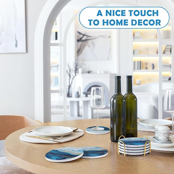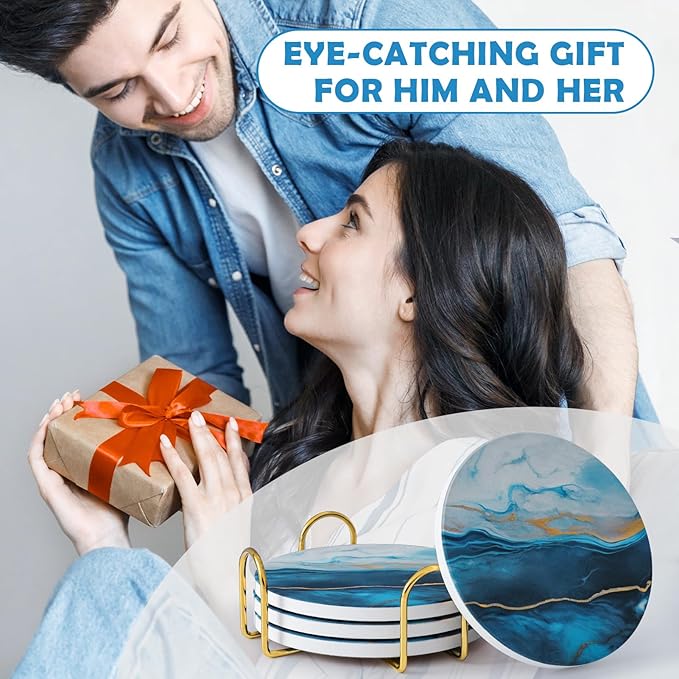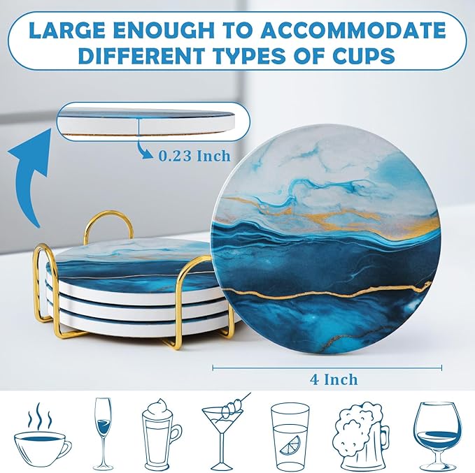 GOH DODD Coasters for Drinks Set of 4, Absorbent Marble Style Ceramic Coaster Set Tabletop Protection Home Decor with Metal Golden Holder for Coffee Table, Father‘s Day Gifts, Blue, Round, 4 Inches