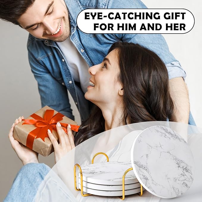 - GOLD METAL HOLDER INCLUDED: With a gold metal holder, it can be used to decorate the desktop, adding both beauty and practicality. Ceramic coasters can be stacked on the metal holder, saving storage space and protecting them from bumping into each other, preventing wear and tear while keeping them clean.