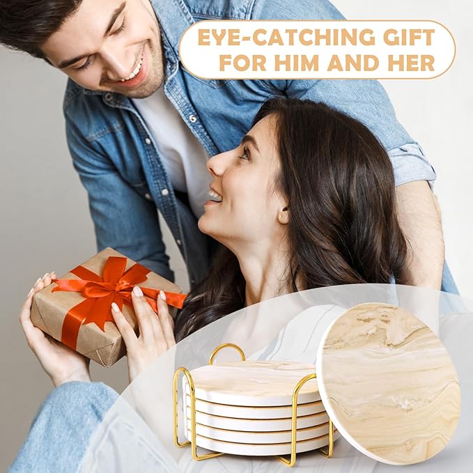 - GOLD METAL HOLDER INCLUDED: With a gold metal holder, it can be used to decorate the desktop, adding both beauty and practicality. Ceramic coasters can be stacked on the metal holder, saving storage space and protecting them from bumping into each other, preventing wear and tear while keeping them clean.