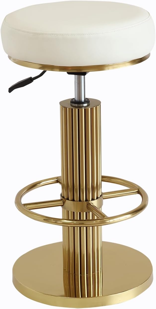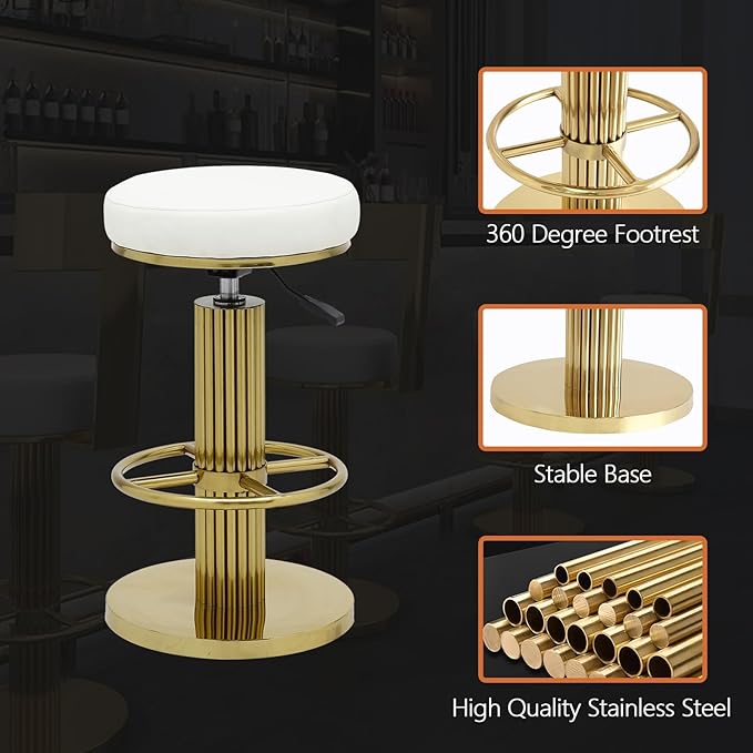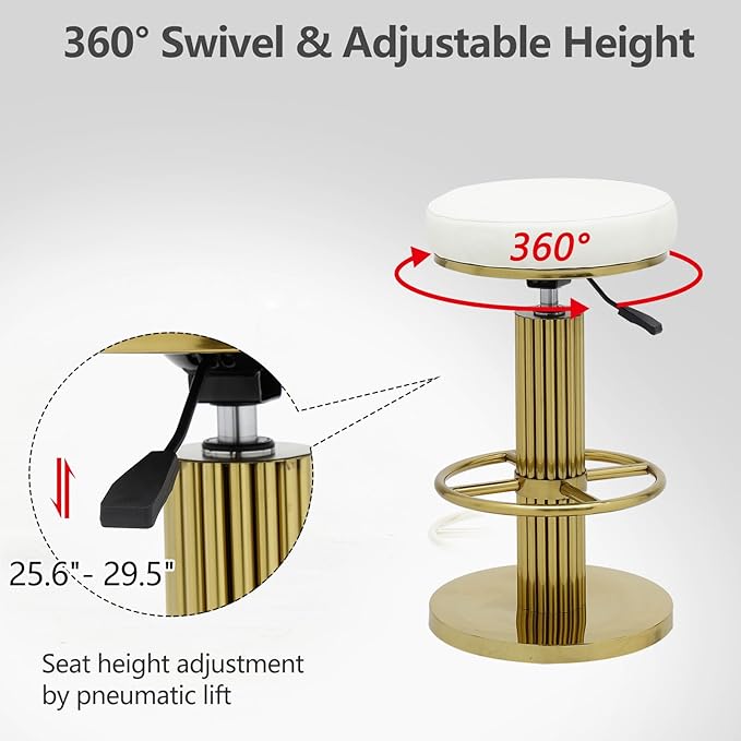 - 【Height Adjustable & 360 Degree Swivel】By adjusting the air lift handle, you can easily adjust the seat height of the white and gold bar stools from 25.6 inches to 29.5 inches to accommodate counters of different heights. The gold counter height bar stools can be rotated 360 degrees to bring you more convenience and comfort.