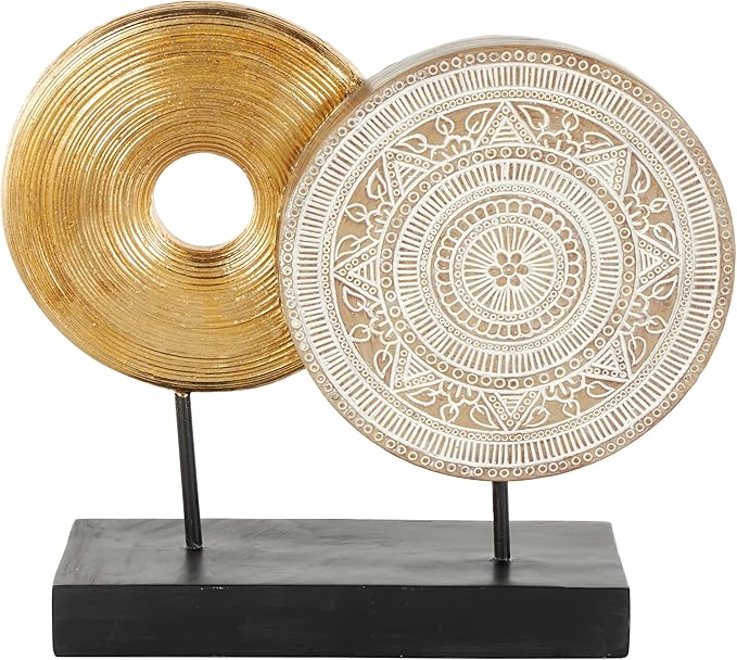 - GEOMETRIC ROUND SCULPTURE Bohemian-style resin sculpture, with intricate gold geometric designs and creative carvings, serves as an intriguing room focal point