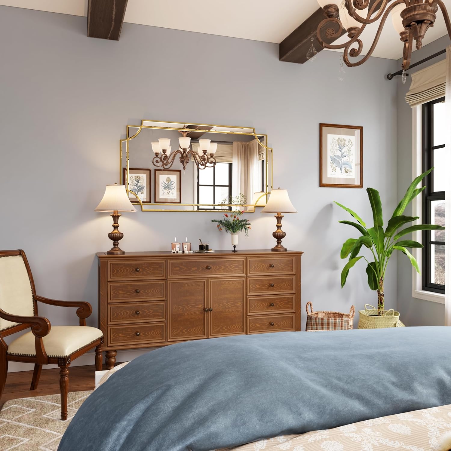 - GOLD FOIL FINISH. The mirror has a hand-applied gold foil finish. Its inherently textured detailing provides the mirror with unique character and charm. Whether you're using it as a wall art, vanity mirror or bathroom mirror, the large surface area allows it to brighten and expand any space it occupies. This mirror is also a perfect choice for your farmhouse makeover, fireplace mantle or bedroom furniture upgrade.