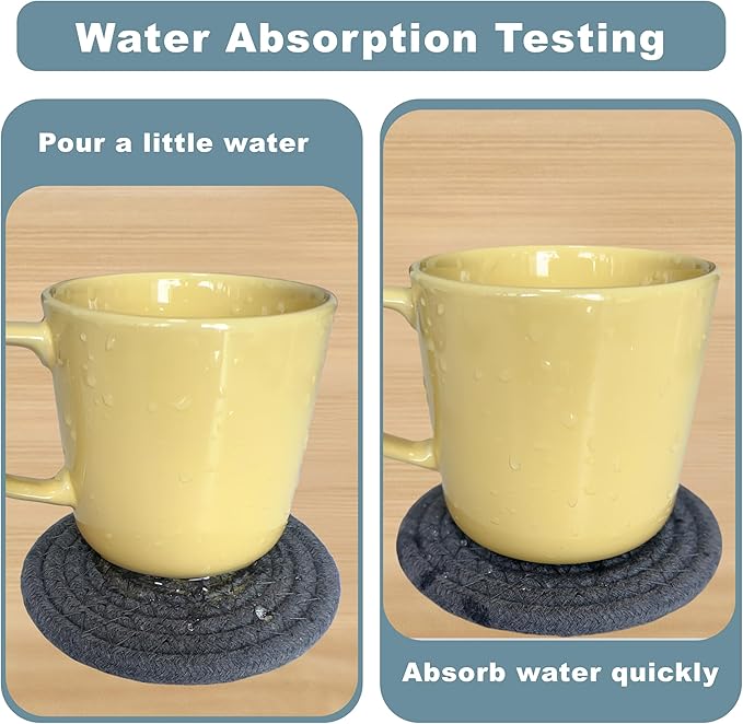 - More concerned about your tabletop: The beverage coaster is handmade from cotton, and compared to other materials like silicone and wood, it exhibits superior water absorption. This coaster can absorb spilled water, allowing it to evaporate and keep the surface dry and tidy.