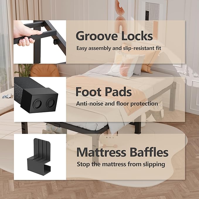 - Special Feature : 12.6 inch Under-bed Storage Space, Anti-slip Mattress Stopper, No Box Spring Needed, Reserved Headboard Holes and Noise-free Rubber Pads, Squeak Resistant 12.6 inch Under-bed Storage Space, Anti-slip Mattress Stopper, No Box Spring Needed, Reserved Headboard Holes and Noise-free Rubber Pads, Squeak Resistant