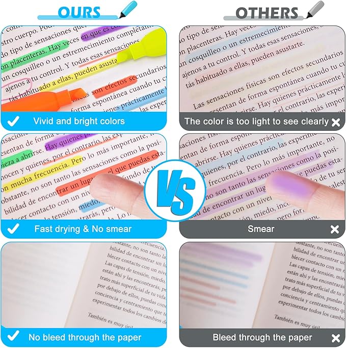 - Non Bleed & Quick-Drying Highlighter - Highlighter pens use quick-drying ink, making highlighted marks clearly visible without worrying about the ink staining your hands and your book. Even if you highlight on one side of the page, the other side is still completely readable, and there's no need to worry about ink bleeding through and affecting the readability of the page.
