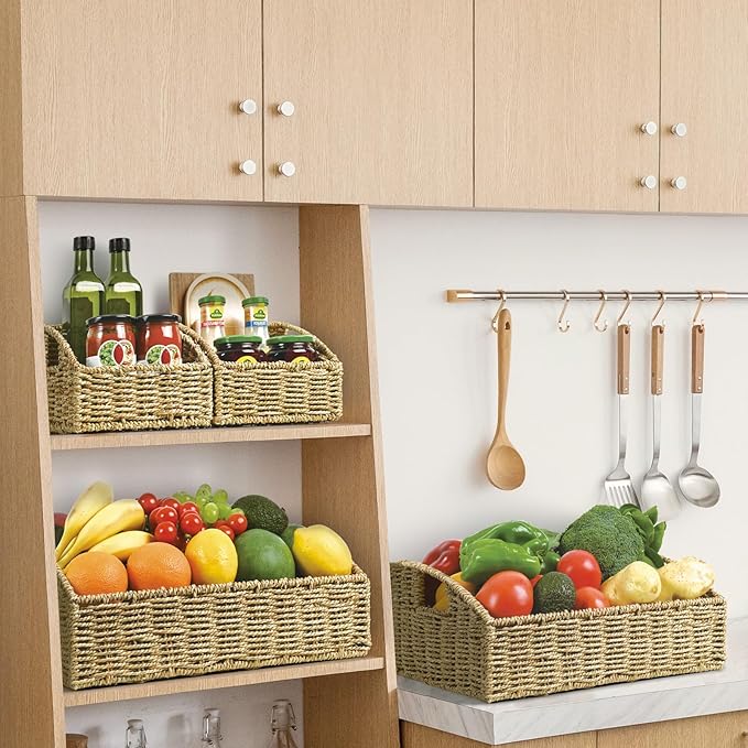 - GREAT VERSATILITY: Versatile pantry baskets provide you with a simple yet elegant way to neatly store and organize spices, vegetables, canned foods, bottles, magazines, clothes, scarves, gloves, laundry, kids' toys or other household items.