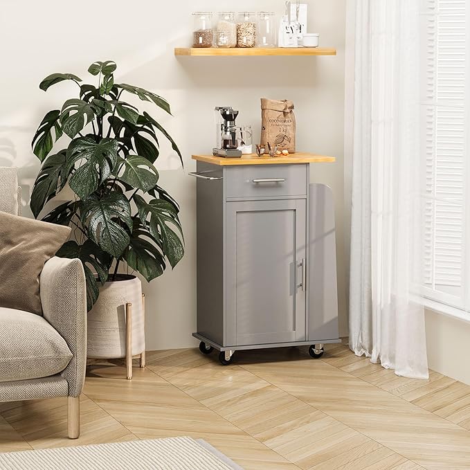 Shintenchi Small Kitchen Island on Wheels with 3-Tier Side Spice Rack and Rubber Wood Top, Trolley Cart with Storage Cabinet & Drawer and Handle/Towel Rack, Gray