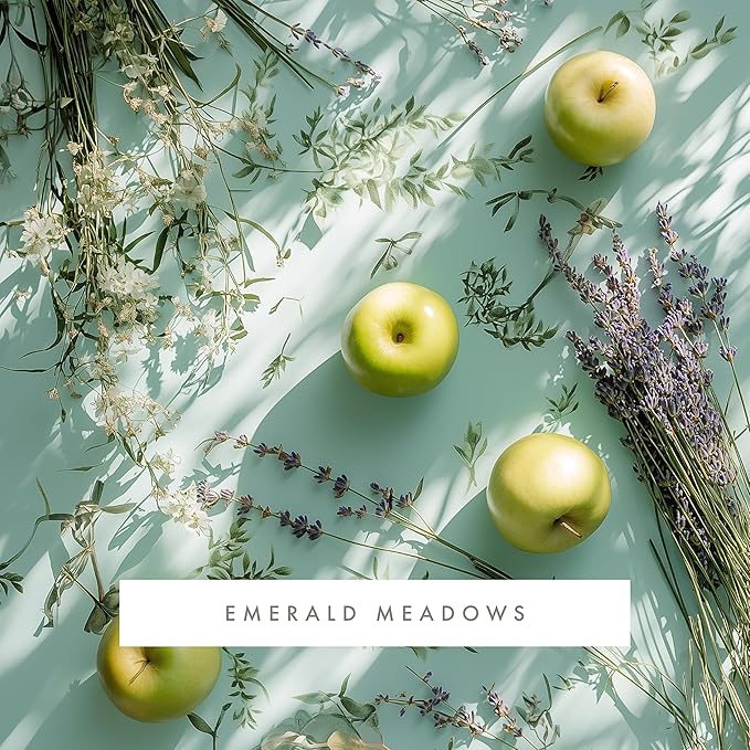 - EMERALD MEADOWS: Calming notes of meadow grass, wild lavender, and earthy woods, sweetened with lush green apple, peach, and pineapple.