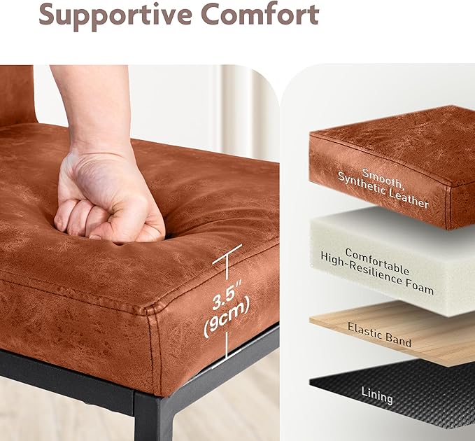 - [Upholstered PU Leather Seat]: The kitchen counter stools feature a retro matte leather surface that efficiently prevents water and stains, making cleaning easy. The 3.54" thick upholstered seat design with a soft backrest ensures a cozy seating experience. Upgrade your dining area now use our stylish counter height bar stools!