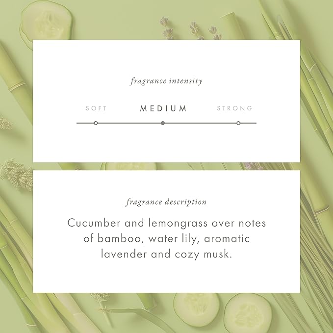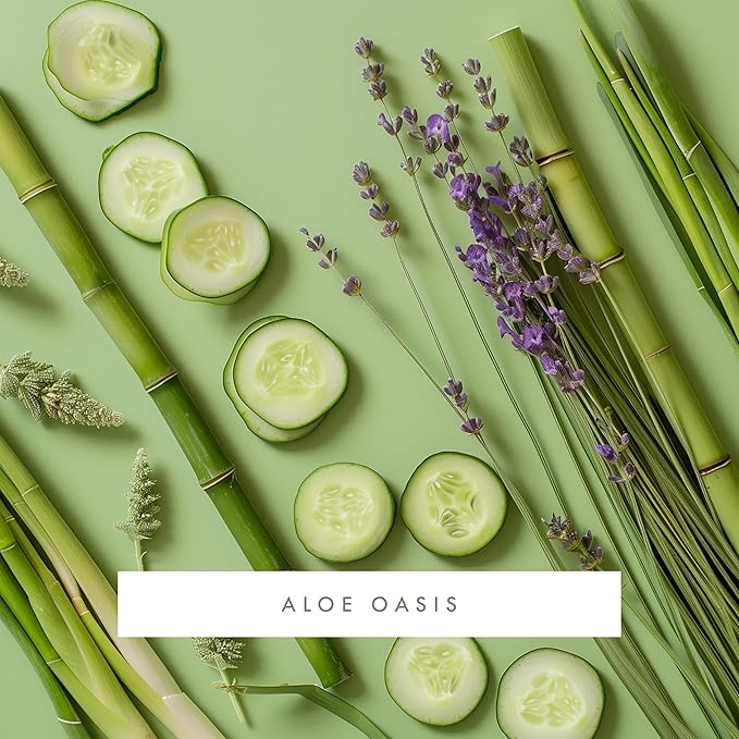 - ALOE OASIS: Cucumber and lemongrass top notes of bamboo, water lily, aromatic lavender and cozy musk.