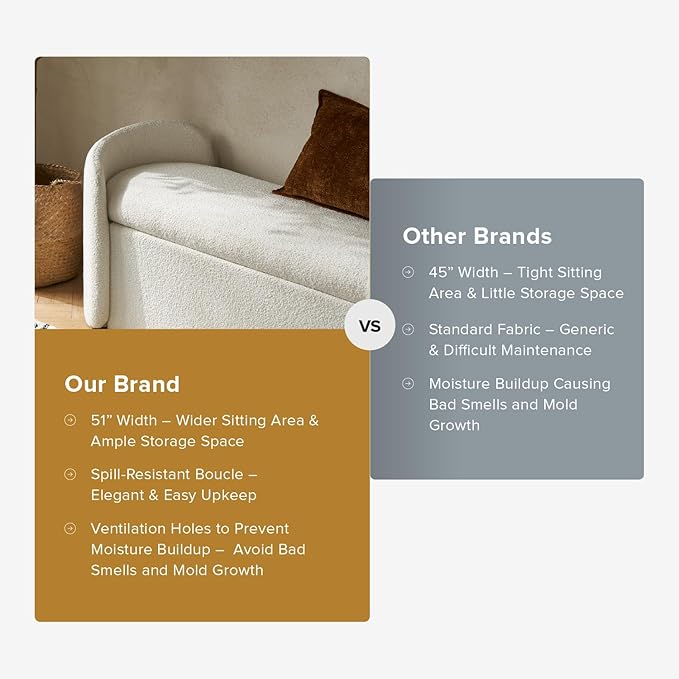 mopio Sophie 51" Ottoman Storage Bench, Entryway and Window Seating, End of Bed Curved Stool for King & Queen Bed, Storage Chest for Bedroom (Pearl White Boucle)