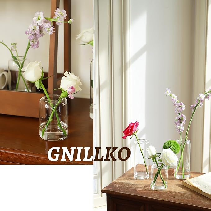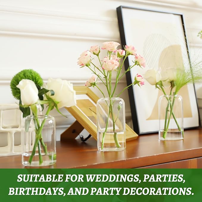 - 🌸Quality & Safety: Clear glass bud vases is made of selected premium thick borosilicate glass,hand-blown to a bright and high transparent finish with durable and sturdy. The top of the vase is smooth with no sharp edges, ensuring safety during the flower arrangement process. Note: Remember to add an appropriate amount of water according to the quantity and weight of the flowers for stability.