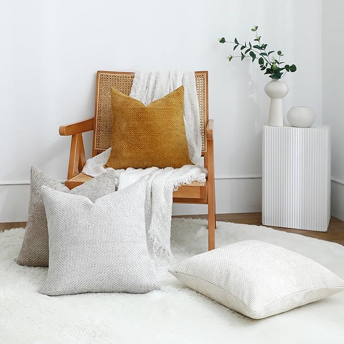 Stellhome 4 Packs Neutral Decorative Throw Pillow Covers Chenille Woven Textured Luxury Accent Cushion Cases for Living Room Couch Bed Sofa Farmhouse Boho Home, 16x16 inch, Neutral Mustard Yellow