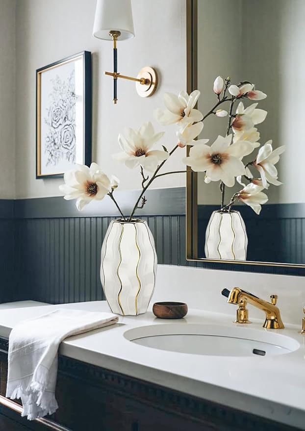 - Premium Handcrafted Ceramic Vase: Crafted from high-quality ceramic, this gold vase features a pristine white finish and shimmering gold details, adding sophistication to any vases home decor setup. This vase-inspired design features a thickened, weighted base for stability, preventing tipping even with tall floral arrangements. Its smooth, leak-proof interior ensures easy cleaning and long-term durability.