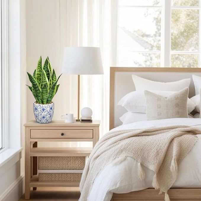- GOOD SIZE:FAUX snake plant height approx: 15.7", blue and white porcelain pot: 5.1"W x 4.7"H. Please read the measurement more attentively. It's a really good size for placing on a tabletop or on the floor. A matte white planter balances the sturdy leaves with the base of the plant, simulation soil makes it looks real enough