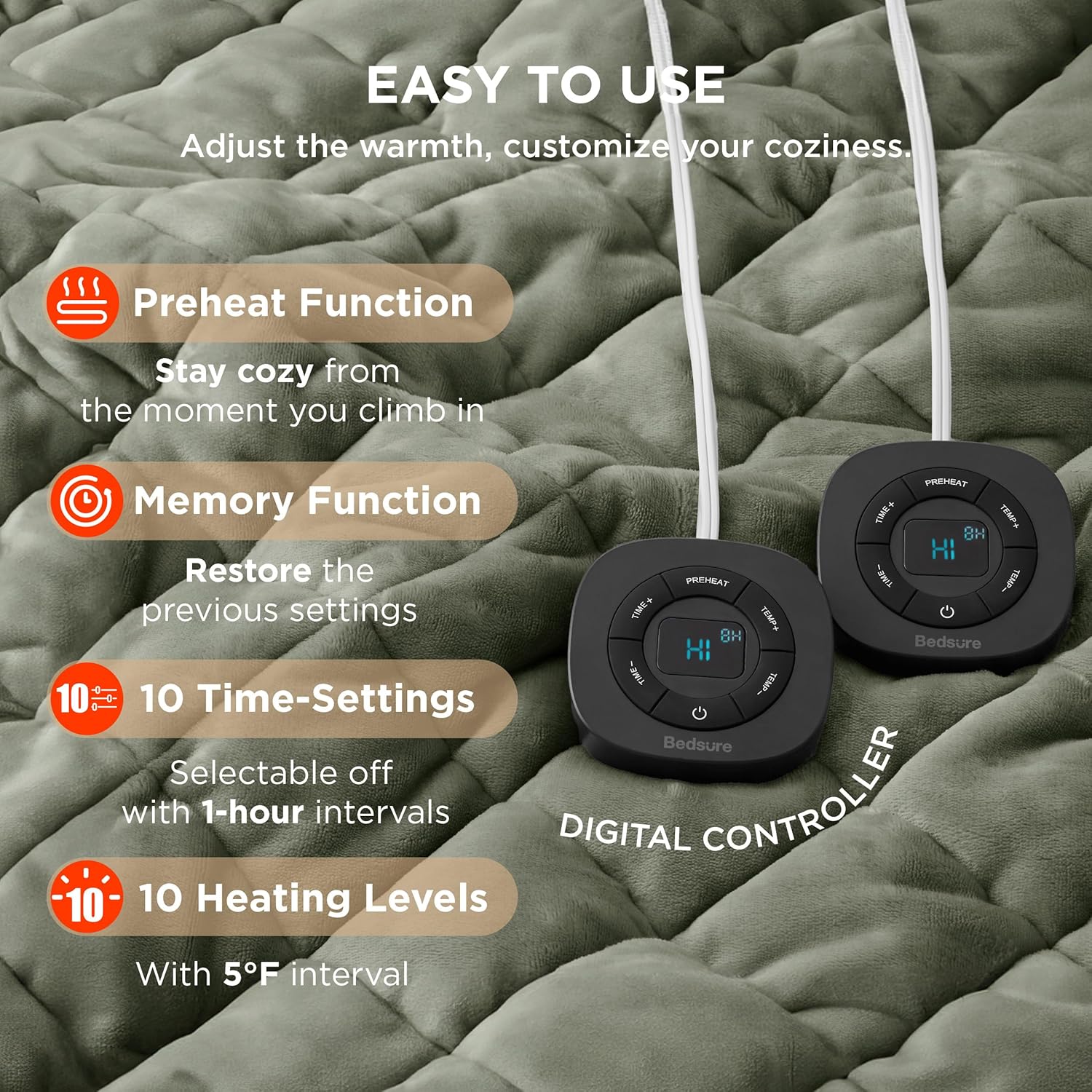 - Easy to Use: This king size electric blanket with dual control guarantees comfort for thermally incompatible couples. Preheat function conforms to changes in body temperature, keeping you warm and comfortable all night without feeling dry. Memory function restores the previous settings, tailored to your own preferences