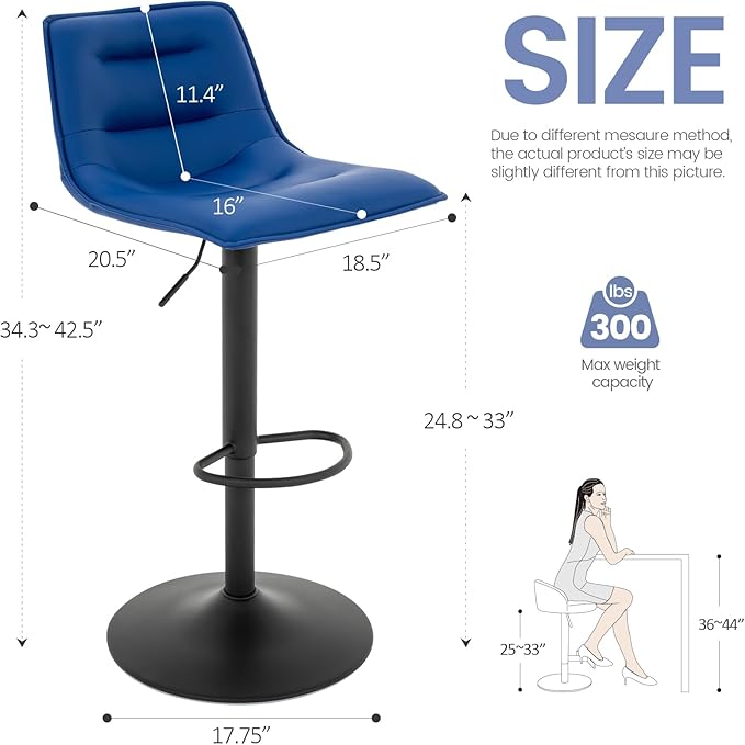 - [ Stable & Safe ] Solid wood seat frame, high quality gas lift, sturdy metal pole and large base (diameter is 17.75"), makes this barstool more stable and durable, also assures seating safety. Max weight capacity is up to 300 lbs. Base with plastic ring, antislip and prevents floor from scracthes.